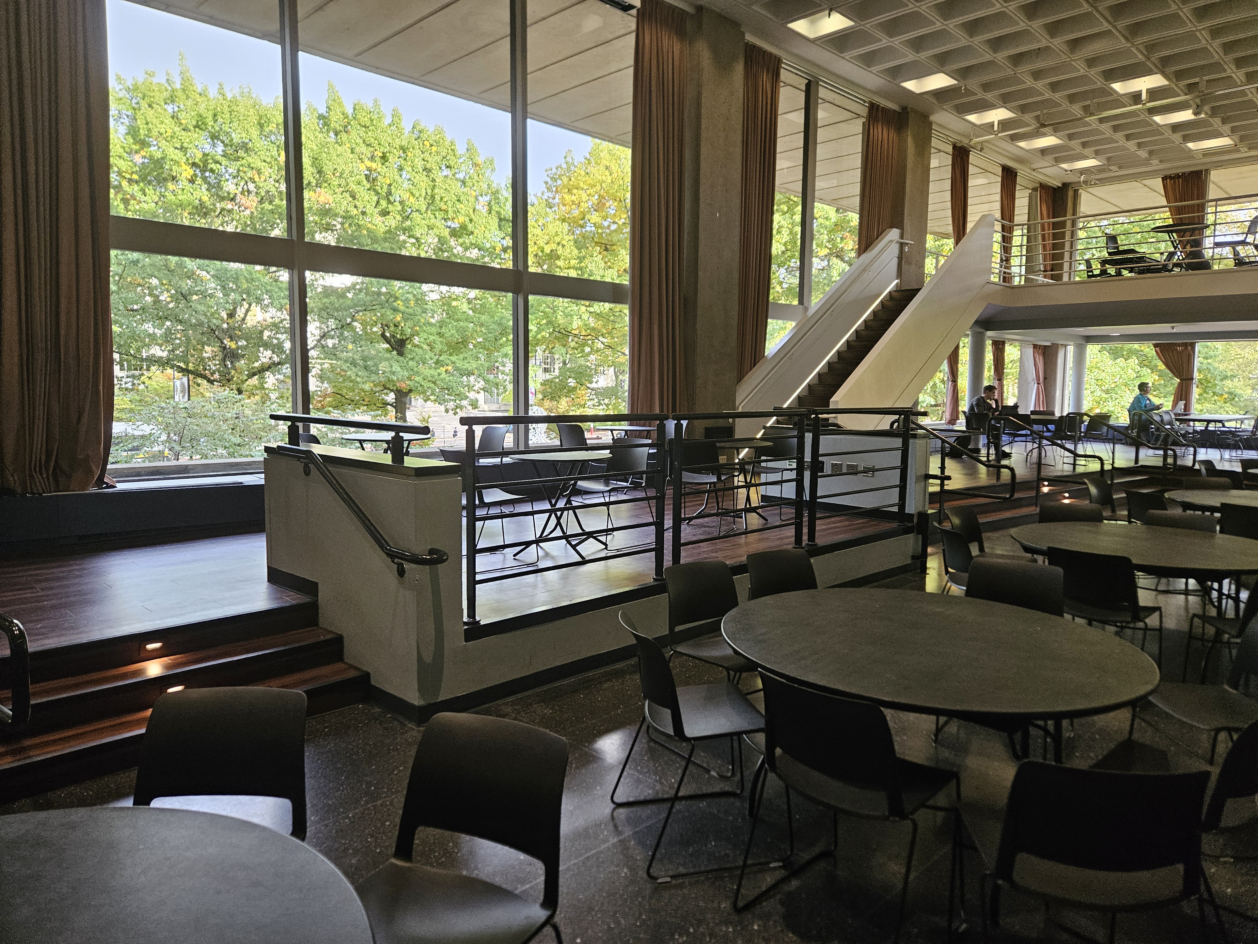 I booked Lobdell Dining Hall and notified the campus event space managers what setup I would need. By default, the hall is set up for banquet-style dining, which meant we'd be in good shape for the show and subsequent dinner. (If you ask, they take down the railings and the small tables on stage beforehand.) The Ohms had also performed there at a past gig, so I knew the stage would be reasonably-sized.